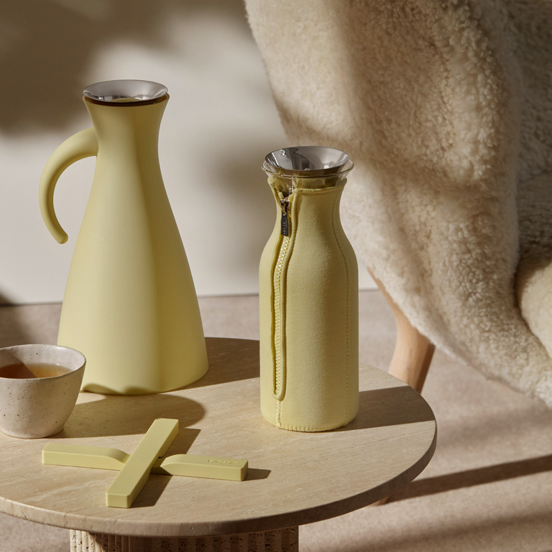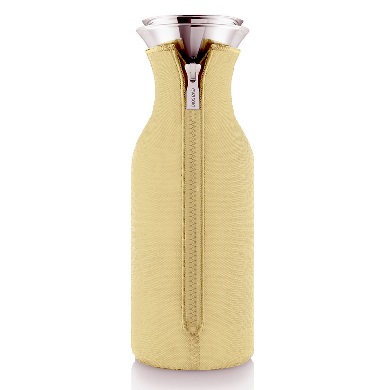 Eva Solo Jääkaappikaadin on toiminnallista kauneutta parhaimmillaan. Sen muoto on lainattu klassiselta maitopullolta. Lasinen kaadin mahtuu juuri sopivasti jääkaapinoveen ja on konepestävä. Leveä suuaukko mahdollistaa sitruunan tai jääkuutioiden lisäämisen, ja patentoitu tippareunus estää yhdenkään tipan valumisen pöydälle. Automaattikorkki avautuu kaadettaessa ja sulkeutuu taas kun kaatimen nostaa pystyyn. Juoma säilyy korkin alla suojassa jääkaapin tuoksuilta, ja toisaalta sitruunat pysyvät kaadettaessa kannun sisällä. Neopreenitakki pitää juoman oikeassa lämpötilassa pidempään.