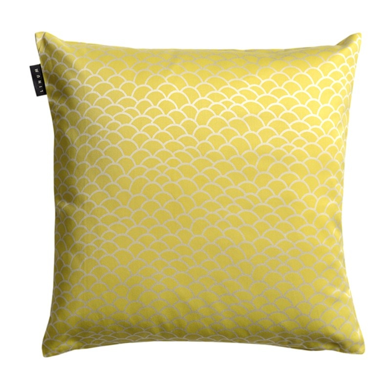 Linumin Ascoli tyynynpäällisen sitruunankeltaisella pohjalla vaaleat kaaret heijastavat valoa kauniisti.