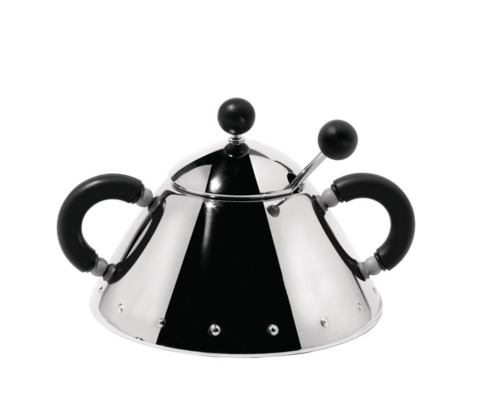 Alessin todellinen klassikko, teräksinen sokerikko 9097 mustilla kahvoilla kuuluu Michael Gravesin suunnittelemaan MG-tuoteperheeseen. Sokerikossa on mukana uniikki teräslusikka.