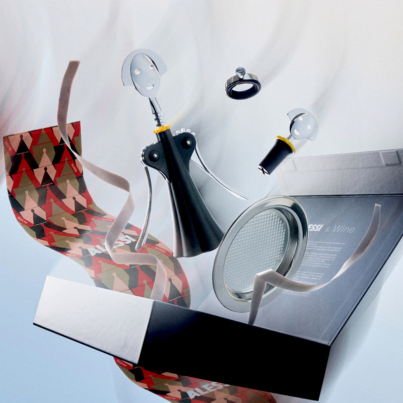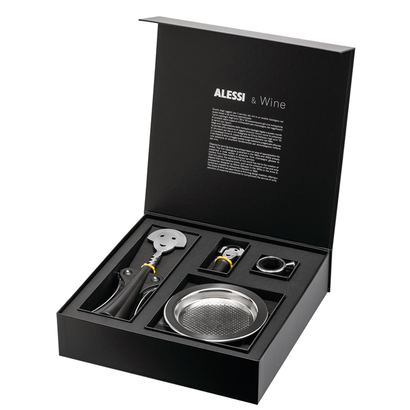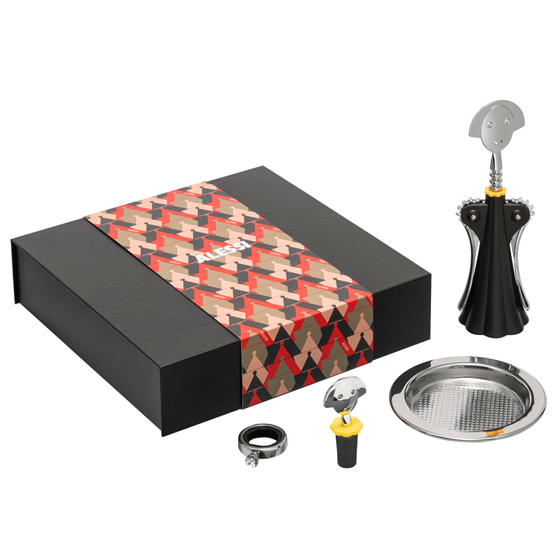 Täydellinen lahja viinin ystävälle! Alessin GAM01SET lahjapakkaus sisältää Alessandro Mendinin suunnitteleman Anna G. klassikkokorkinavaajan ja korkin, Noe tipparenkaan sekä Ettore Sottsassin suunnitteleman tyylikkään 5009/15 teräslautasen viinipullolle.