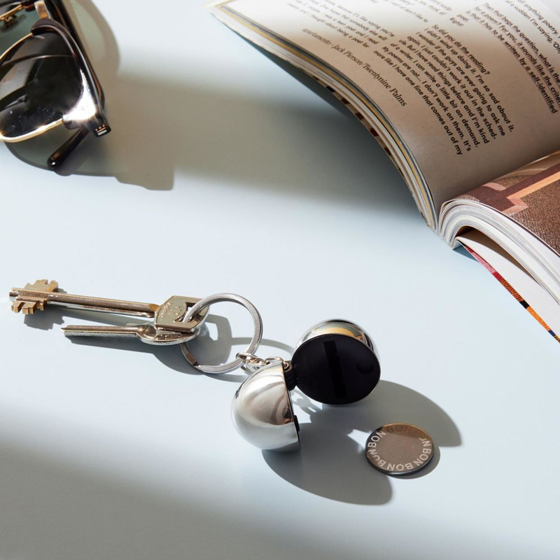 Alessin Bon Bon avaimenperä löytyy helposti pyöreän muotonsa ansiosta taskusta tai laukusta. Bon bon kätkee sisäänsä poletin, mutta sen tilalle mahtuu myös yhden euron kolikko.