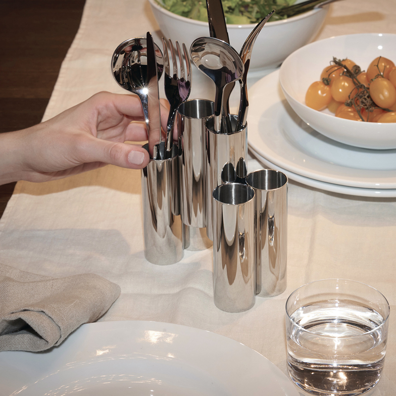 Alessi Canale aterinteline on Patricia Urquiolan suunnittelema käytännöllinen uutuus. Canale sopii aterinten kuivaustelineeksi tiskipöydälle, koska telineessä on rei’itetty pohja. Teline on painava, tukeva ja pysyy hyvin pystyssä. Alessin Canale-aterinteline tuo pöytäkattaukseen kivan idean: erillisten kattauspaikkojen sijaan koko porukan aterimet ovat tarjolla samassa telineessä.