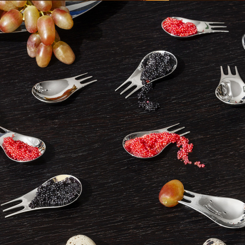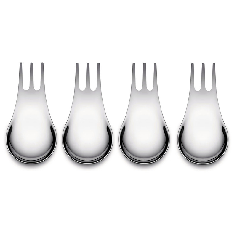 Alessin Moscardinot ovat monitoimiaterimia, jotka toimivat myös ottimina: leikkelehaarukka, tapas-aterin, amuse… Pakkaus sisältää 4 kappaletta Compasso d´oro palkittuja lusikka-haarukka aterimia. Materiaali on konepestävää kiiltävää terästä.