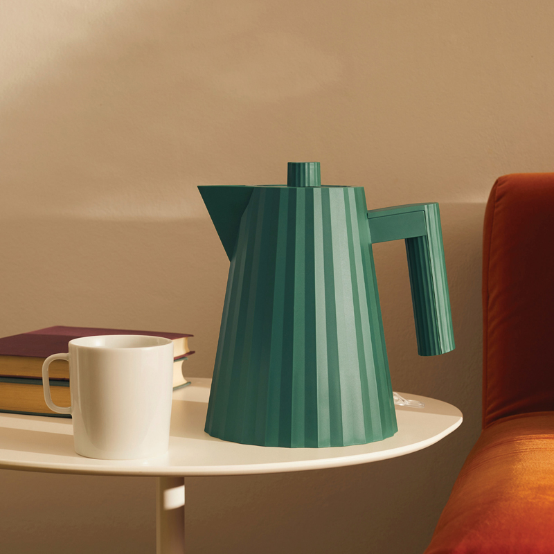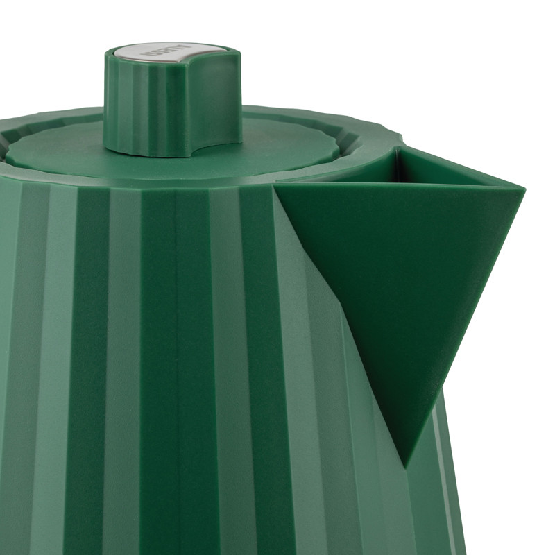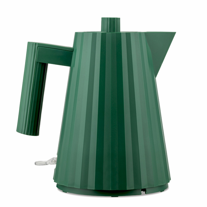 Michele De Lucchi on suunnitellut Alessille upean veistoksellisen Plissé vedenkeittimen. Uutuusväri vihreä! Suunnittelijaa on ispiroinut pliseerattu kangas –  vedenkeitin tuo mieleen kuuluisien muotitalojen haute couture puvut! Virtalähde alusta integroituu lähes huomaamattomasti kannun pohjaan. Sähköisen vedenkeittimen kuori on valmistettu muovista ja sen vuoksi keitin on kevyt käytössä. Sisältä keitin on  terästä. Kannessa on helppokäyttöinen ja näppärä pikakorkki.