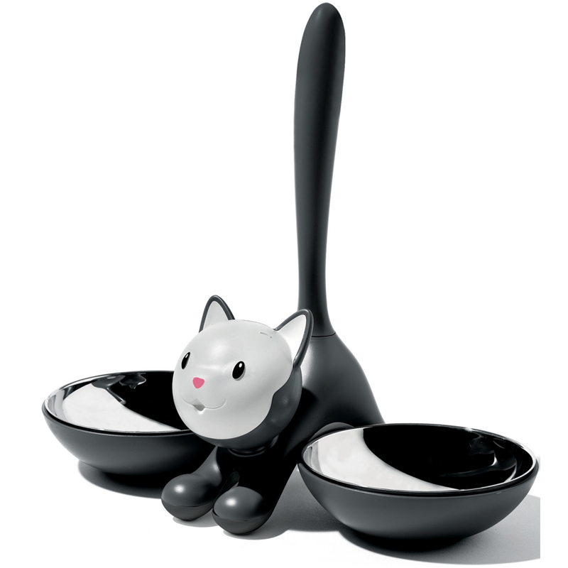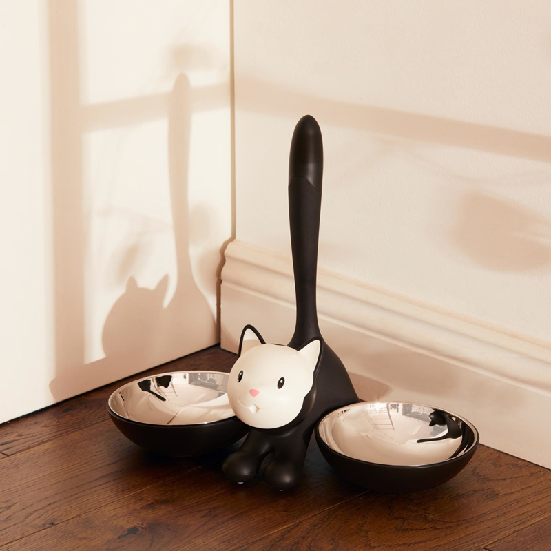 Alessi Tigrito kissan ruoka- ja juomakuppi on hauska ruokailusetti kissalle. Kahta kulhoa yhdistää niiden välissä oleva ihastuttava kisuli. Ruostumattomasta teräksestä valmistetut sisäkulhot saa helposti täytettäväksi ulos astioistaan.
