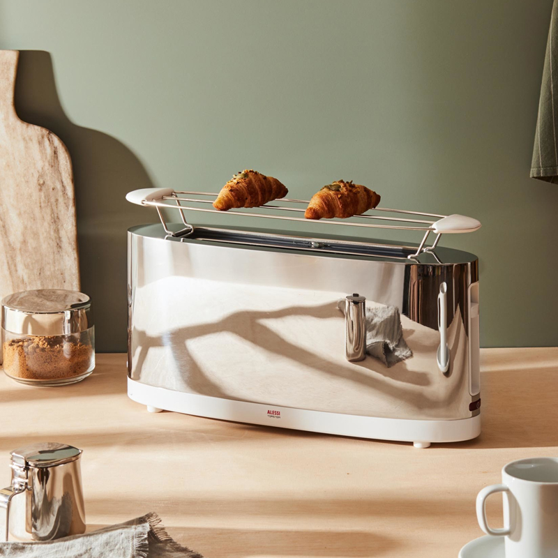 Alessi Toaster SG68 on ruostumattomasta teräksestä valmistettu SG68 leivänpaahdin loistaa keittiössä kuin keittiössä! Stefano Giovannonin suunnittelemaan leivänpaahtimeen kuuluu käytännöllinen lämmitysritilä. Paahtimessa on lämmitysasteen säädin, DEFROST- näppäin sekä ulosvedettävä murujenkerääjä.
