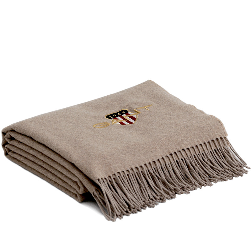 Gantin hienostunut vaalean hiekan sävyinen torkkupeitto on helppo yhdistää sisustukseen. Archive shield-sarjan pehmeä huopa lämmittää iltaisin terassilla tai hemmottelee sohvalla lepäilijää. Peittoa koristaa brodeerattu Gantin ikoninen vaakuna tunnusmerkki 1949-luvulta. Torkkupeiton molemmissa päissä on kauniisti kierretyt hapsut.