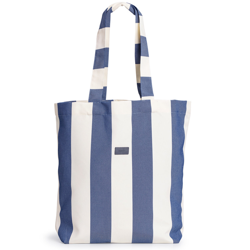 Gantin raikkaan sini-valkoraidallinen kassi on säänkestävää kangasta. Laukun hihnat yltävät myös olkapäälle. Trendikäs kassi mukaan shoppailureissuille tai veneilylle!
