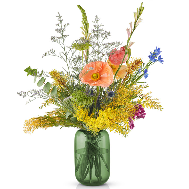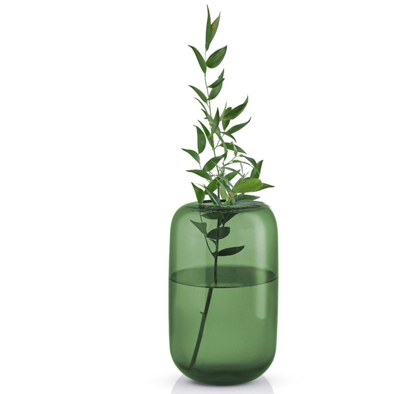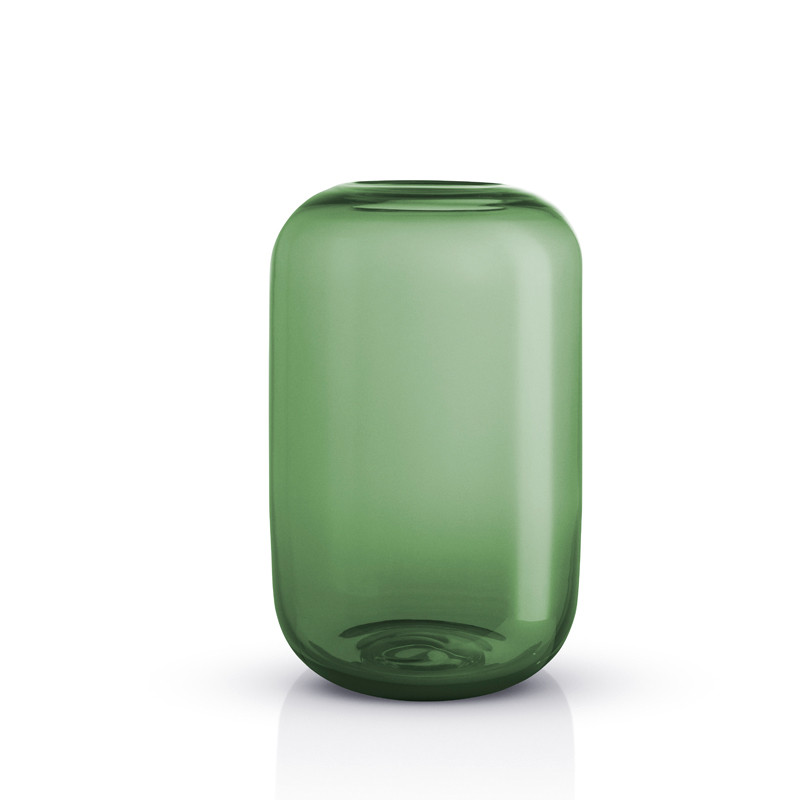 Eva Solon käsin puhalletusta värilasista valmistetut kauniit Acorn vaasit viimeistelevät näyttävän sisustuksen. Lasimaljakon pyöristetty suuaukko asettelee kimpun ja oksat täydellisesti, samalla kun kauniisti valoa heijastava maljakko paljastaa kukat varsia myöten. Vihreä vaasi on upea sisustusesine myös tyhjänä!