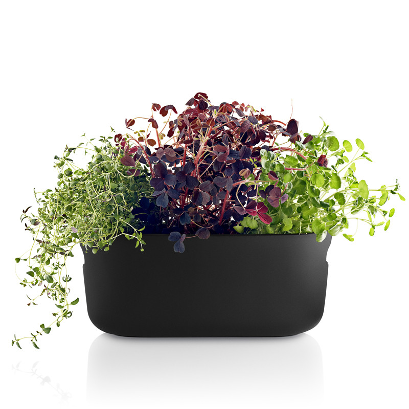 Eva Solon keraamisessa yrttilaatikossa on tilaa useammalle ruukulle, joten siihen saa koottua näyttävän kokonaisuuden erilaisia yrttejä omissa ruukuissaan. Yksinkertainen altakastelujärjestelmä perustuu kapillaari-ilmiöön ja sen avulla yrtit pystyvät ottamaan juuri tarvitsemansa määrän laatikon pohjalle varastoitunutta vettä. Näin kastelun tarve vähenee ja yrtit pysyvät elinvoimaisina vaikka kukaan ei olisi muutamaan päivään kotona niistä huolehtimassa. Kädensijojen ansiosta laatikkoa on helppo ja kätevä siirrellä.