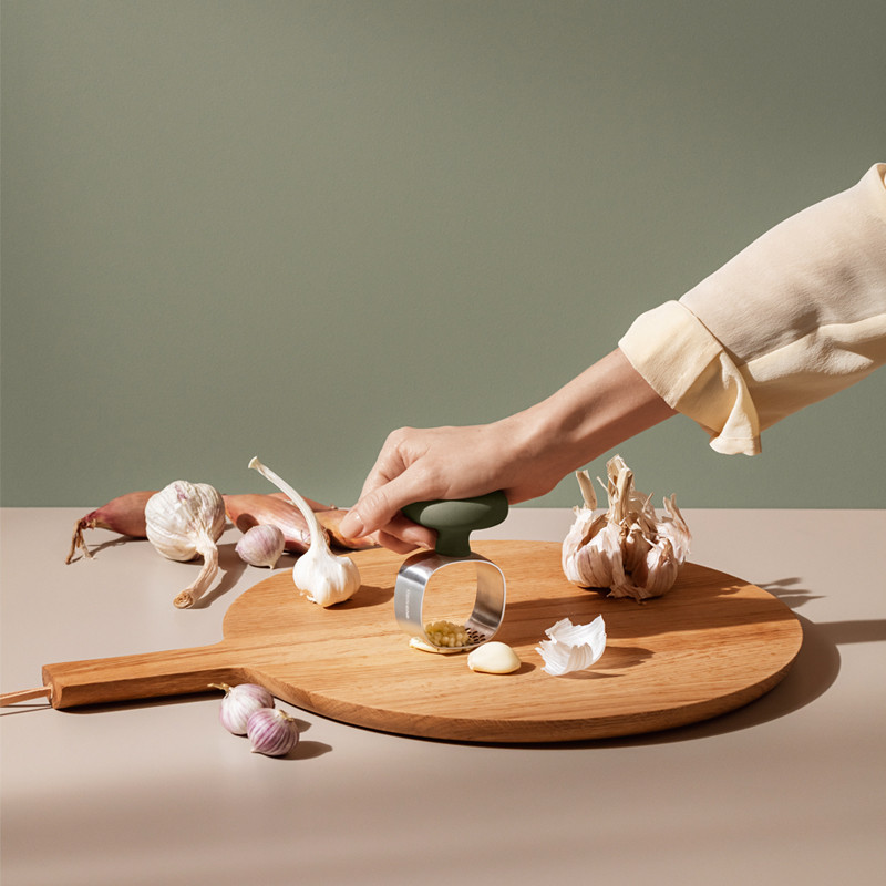 Eva Solon yksinkertaisen nerokas valkosipulin murskain hienontaa valkosipulin yhdellä painalluksella. Leveästä kädensijasta saa hyvän otteen. Murskain on todella helppo huuhdella puhtaaksi tai halutessasi voit laittaa murskaimen myös astianpesukoneeseen.