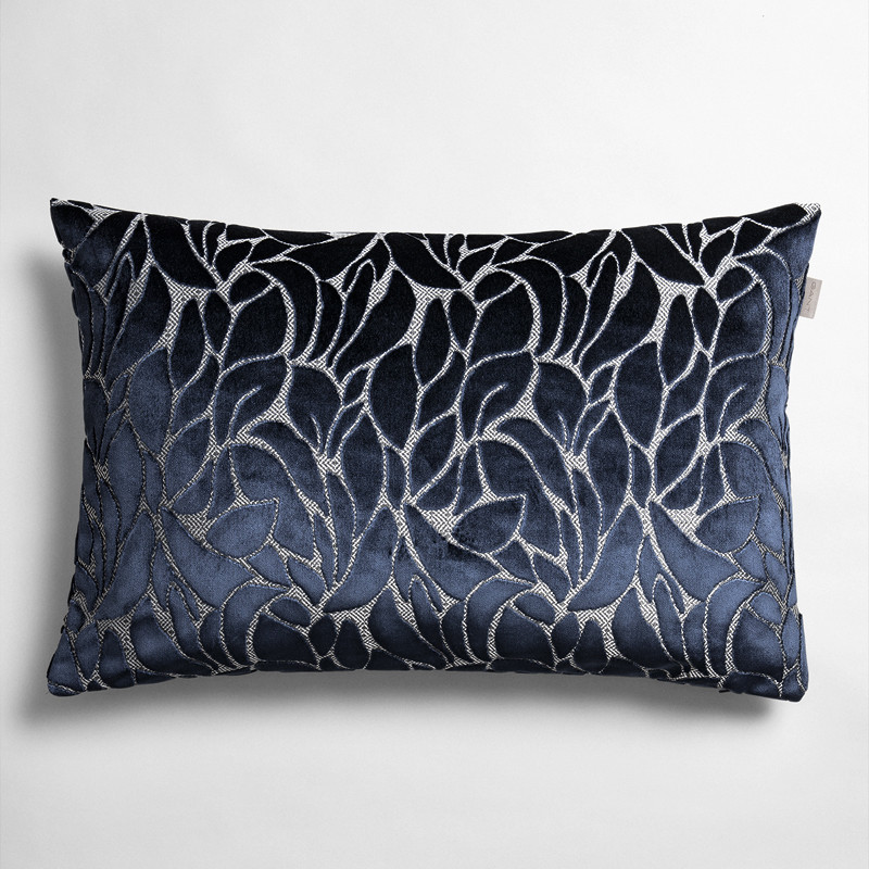 Gantin Velvet leaf-tyynynpäällisen lehtikuviot hohtavat ylellisinä samettisina kohokuvioina. Plyysisametin sävy heijastelee eri suunnista katsottuna elävästi musteen sinisen sävyissä. Pohjakangas on kudottu hohtavan hopeaisilla kuvioilla tummalle pohjavärille. Tyynyn sivusaumassa on piilovetoketju ja harmaa nahkainen Gant label.