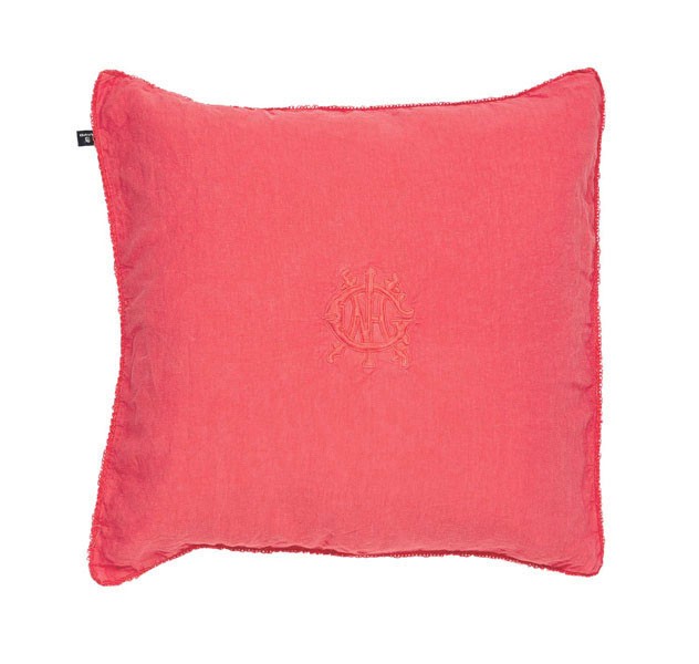 Gantin Washed linen embroidery on herkullisen melonin värinen ja rento tyynynpäällisen. Materiaali on ihanan pehmeää kivipestyä pellavaa. Päällisen reunoja koristaa pitsimäinen tikkaus ja keskelle on brodeerattu Gant-logo.