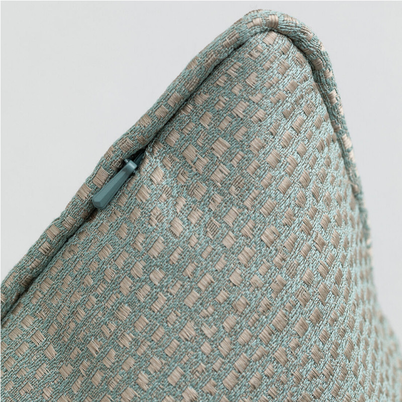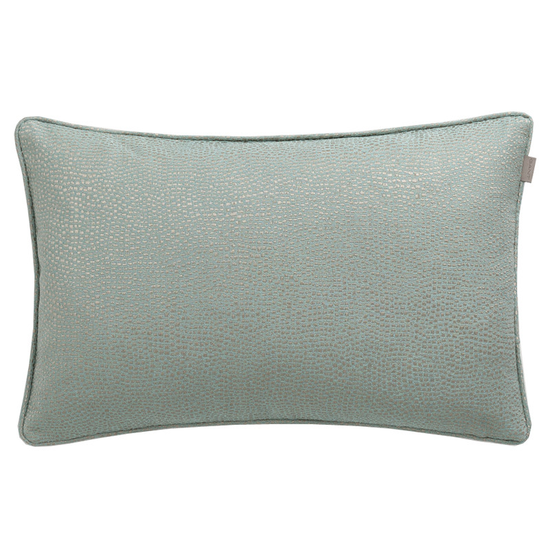 Gantin Gold dot cushion tyynynpäällinen on kudottu jaquard-tekniikalla. Napakka tyynynpäällinen on värisävyltään elegantti pastellin turkoosinvihertävä. Kankaaseen on kudottu metallinhohtoisia pistemäisiä kuvioita, jotka nimestä huolimatta ovat viileän platinan sävyisiä. Reunoja kiertää viimeistelty terenauha ja pitkässä saumassa on piilotettuna vetoketju. Sivusaumaan on ommeltu harmaa nahkainen Gant-label.