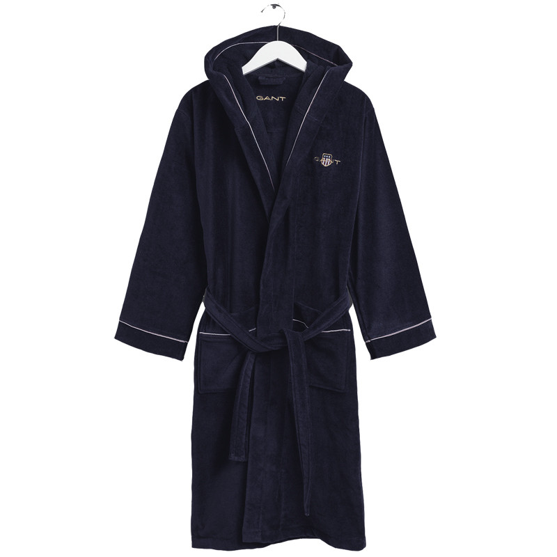 Tyylikäs yön sininen Gantin Archive shield-kylpytakki on pinnaltaan ylellistä plyyshi samettia. Sisäpinta on tiheää ja leppoisan tuntuista froteeta. Kylpytakin etuosaan on brodeerattu Gantin vaakuna-logo. Hupun sisäsaumaa, taskujen ja hihojen reunoja somistaa valkoiset terenauhat. Kylpytakin täydentää saman sarjan kylpytossut sävy sävyyn.