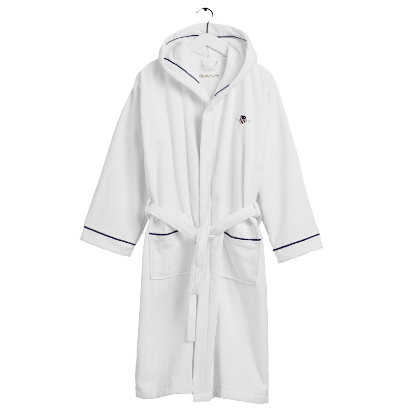 Klassinen valkoinen Gantin Archive shield-kylpytakki on pinnaltaan ylellistä plyyshi samettia. Sisäpinta on tiheää ja leppoisan tuntuista froteeta. Kylpytakin etuosaan on brodeerattu Gantin vaakuna-logo. Hupun sisäsaumaa, taskujen ja hihojen reunoja somistaa tumman siniset terenauhat. Kylpytakin täydentää saman sarjan kylpytossut sävy sävyyn.