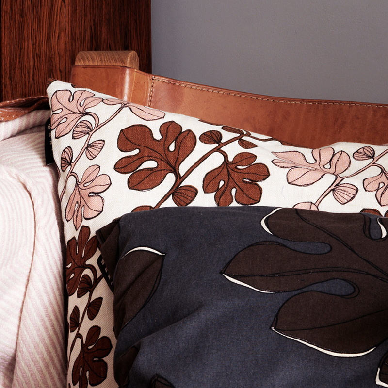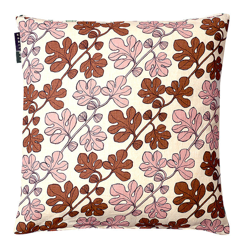 Linum Cary tyynynpäällinen omaa peikonlehdet, jotka versovat roosan ja kuparinruskean sävyissä. Taustaväri on luonnonvalkoinen pellavan sävy. Cary tyynynpäällinen on kaunis sisustuksen yksityiskohta yksinäänkin, mutta sen ympärille voi koota myös runsaan ryhmän roosan, ruskean ja luonnonvalkoisia tyynyjä.