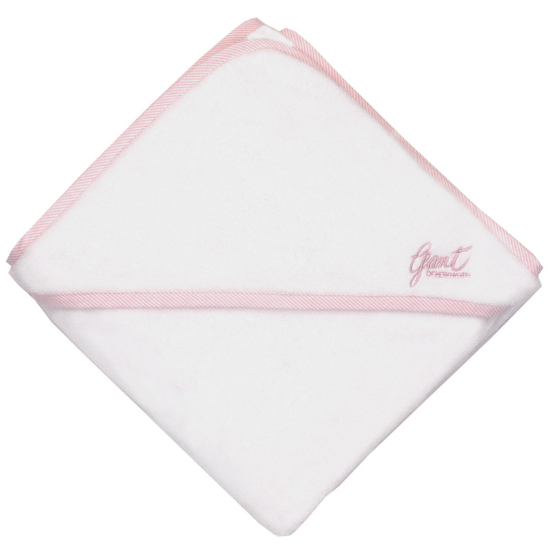 Gantin pumpulinpehmeä hupulinen vauvapyyhe kuivaa pienokaisen hellästi kylvyn jälkeen. Neliönmuotoisen pyyhkeen yksi kulma on kaksinkertainen muodostaen hupun. Pyyhkeen reunat on kantattu vaaleanpunaisella nauhalla. Ihana pyyhe omalle vauvalle tai lahjaksi.