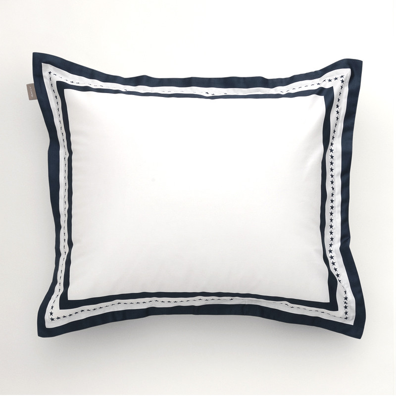 Gantin tyynyliinat ovat vastustamattoman pehmeää 100% puuvillaa, helppohoitoisia ja kestäviä. Upea klassinen tähdillä kuvioitu kehys kiertää tyynyliinan reunoissa. Kääntöpuoliella syvä yönsininen pinta on kuvioitu kokonaan valkoisilla tähdillä.